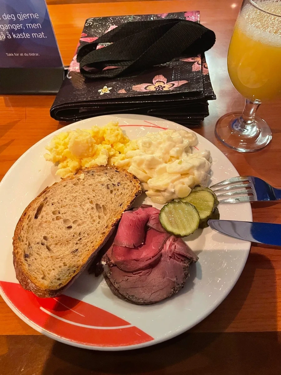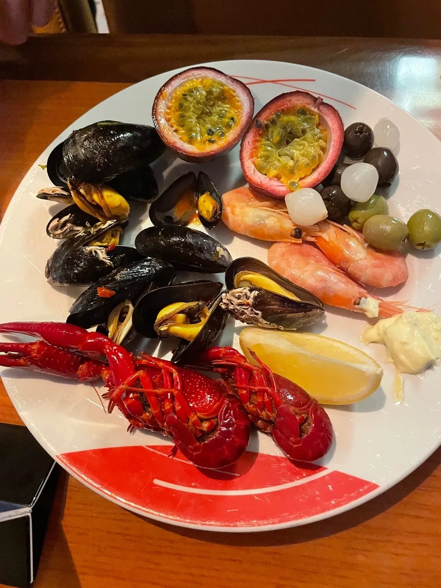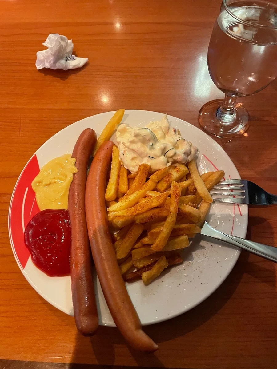 Da var man på nett igjen etter noen timer til sjøs, siste runden med mat ble pølse og pommes åsså en klype rekesalat…